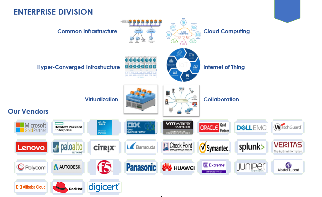 This vertical is covering System, Storage, Hyper-Converged Infrastructure, Network, Security, Unified Communication, Virtualization, Backup, OS, and so on. Starting from consultation, our certified consultants provide the efficient solution proposing to our clients to ensure the long term and scalable business operation. We do have full lot of certified engineers who are equipped with full knowledge with the real hands-on experiences in the field. They did deliver many successful project implementation across the industries.